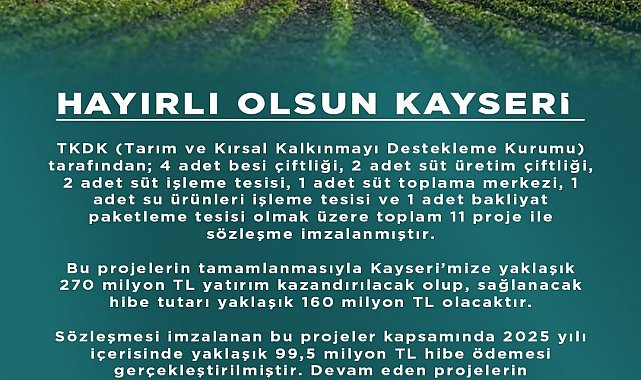 AK Parti Kayseri İl Başkanı Hüseyin Okandan açıklamasında; "Tarım ve Kırsal Kalkınmayı Destekleme Kurumu tarafından 4 adet besi çiftliği, 2 adet süt üretim çiftliği, 2 adet süt işleme tesisi, 1 adet süt toplama merkezi, 1 adet su ürünleri işleme tesisi ve 1 adet bakliyat paketleme tesisi olmak üzere toplam 11 proje ile sözleşme imzalanmıştır. Bu projelerin tamamlanmasıyla Kayseri'mize yaklaşık 270 milyon TL yatırım kazandırılacak olup, sağlanacak hibe tutarı yaklaşık 160 milyon TL olacaktır. Sözleşmesi imzalanan bu projeler kapsamında 2025 yılı içerisinde yaklaşık 99,5 milyon TL hibe ödemesi gerçekleştirilmiştir. Devam eden projelerin tamamlanmasıyla birlikte 2026 yılı içerisinde yaklaşık 60 milyon TL daha hibe ödemesi yapılacaktır. Bu süreçte başta Milletvekilimiz Şaban Çopuroğlu olmak üzere emeği geçen herkese teşekkür ediyoruz" ifadelerini kullandı.