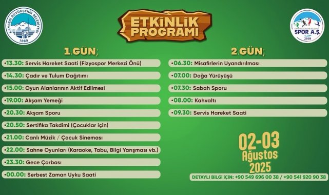 Büyükşehir Belediyesi Spor A.Ş. tarafından 'Doğa Seni Çağırıyor' sloganıyla düzenlenen ve geleneksel hale gelen doğa kampının 2025 yaz sezonu Kayserililerin ilgi ve beğenisiyle sürüyor. Yılın her döneminde birçok etkinlik düzenleyen Büyükşehir Belediyesi, yaz dönemi etkinlikleri çerçevesinde Spor A.Ş. marifetiyle 'Doğa Seni Çağırıyor' sloganıyla düzenlenerek geleneksel hale gelen ve 26-27 Temmuz günlerinde gerçekleşen doğa kampına katılan 200 kişi, keyifli ve verimli bir hafta sonu geçirdi. Çocukları ile birlikte kampa katılan aileler sosyal etkinlik, spor, yarışma, müzik ve piknik gibi pek çok farklı etkinlikle doğanın tadını çıkardı. Hafta sonu Kayserililerin yoğun ilgisi ile karşılaşan doğa kampında doğa yürüyüşü, canlı müzik, çocuk sineması gibi eğlenceli spor aktivitelerinin yanında çocuklara çadır kurulumu eğitimi verildi. Çadır kurulumunun püf noktalarını öğrenen çocuklar, eğlenceli dakikalar geçirdi.