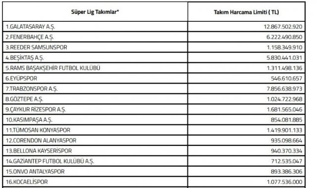 Süper Lig'de mücadele eden Kayserispor'a 2025-2026 sezonunda 940 milyon 370 bin 334 TL harcama limiti belirlendi.