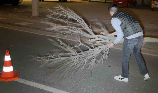 Öte yandan kaza nedeniyle cam ve plastik parçalarla dolu olan yolu, yoldan geçen ve eczacı olduğu öğrenilen Burak Yüksel isimli bir genç kırılan ağacı süpürge gibi kullanıp diğer araçların zarar görmemesi için temizledi. O anlar kameraya yansıdı.