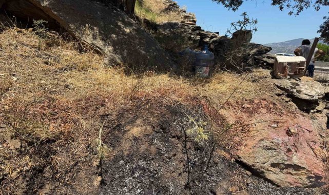 Aydın'ın Çine ilçesinde meydana gelen kaza sonrasında alev alan motosiklet sebebiyle yol kenarında başlayan yangın, yol kenarlarına bırakılan su bidonları sayesinde büyümeden söndürüldü.