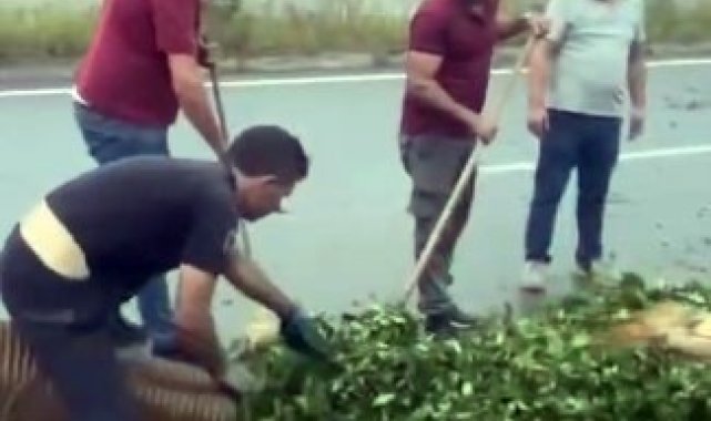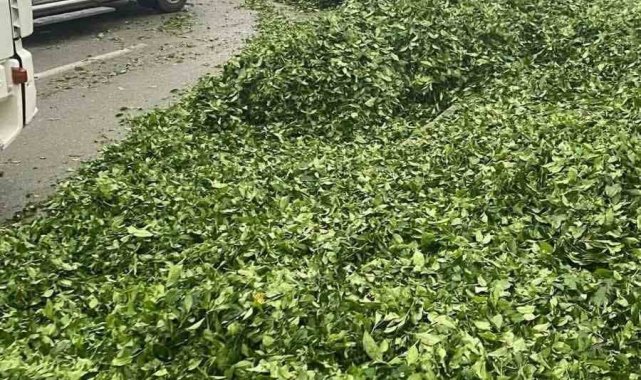 Kaza sonrası yola saçılan kamyon kasasındaki 10 ton çayı böyle temizlediler