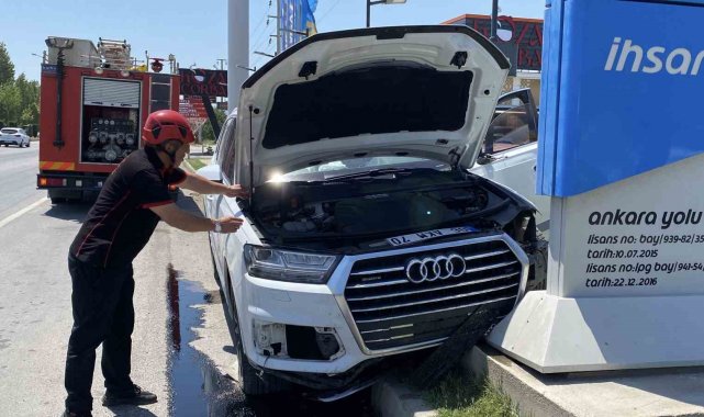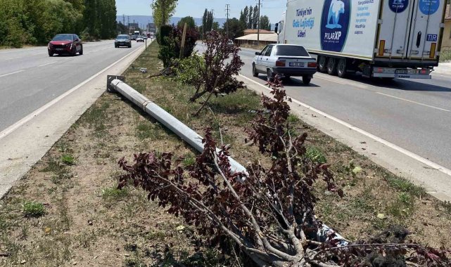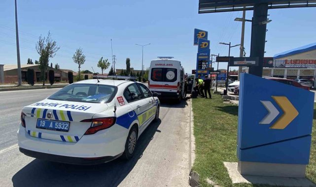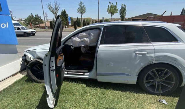 Çorum'da refüjü aşıp karşı şeritteki benzin istasyonunun tabelasına çarpan otomobilin sürücüsü ve yolcu kazayı yara almadan atlattı.