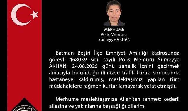 Mersin İl Emniyet Müdürlüğü tarafından, Sümeyye Akhan'ın Batman'ın Beşiri İlçe Emniyet Amirliği kadrosunda görev yaparken senelik iznini geçirmek için bulunduğu Mersin'de geçirdiği kaza sonucu vefat ettiği bildirilerek başsağlığı mesajı yayınlandı.