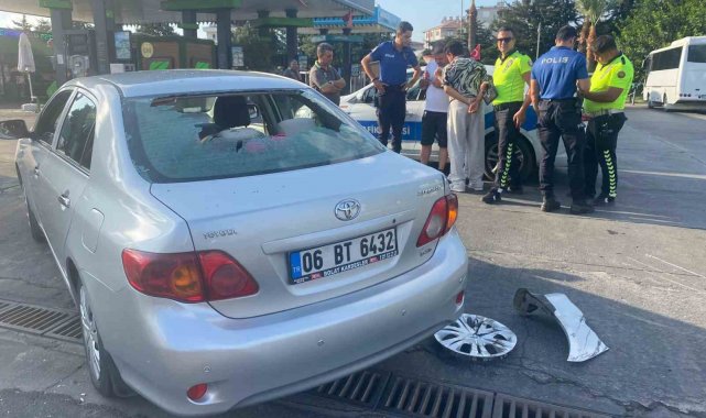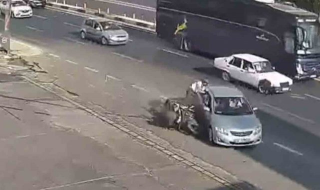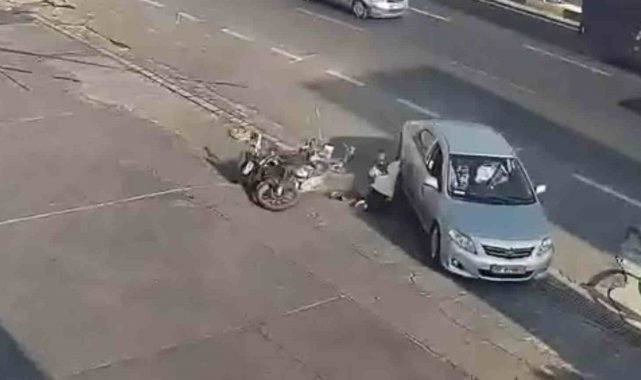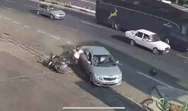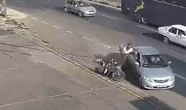 Kazada motosiklet sürücüsü çarpıştığı otomobilin kapısına tutunup sonra yere düştü