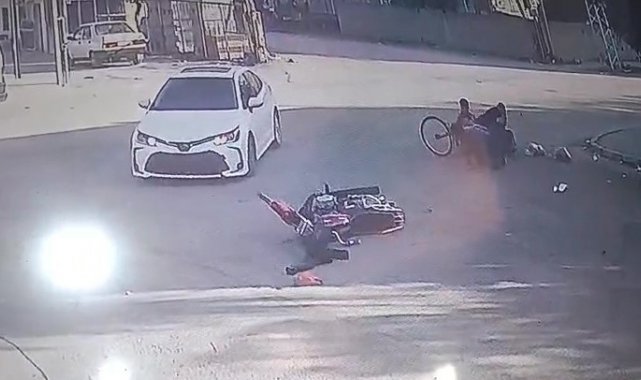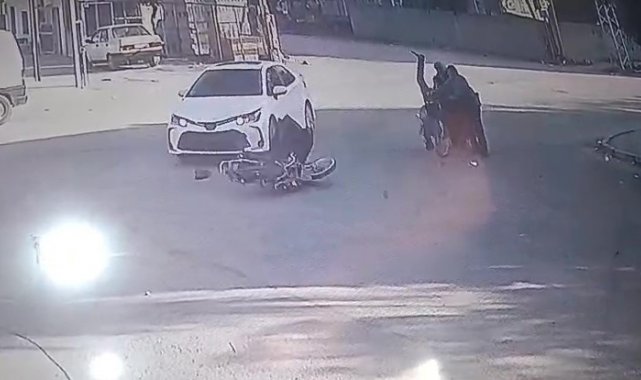Hatay'da otomobille çarpışan motosikletin sürücüsü, metrelerce savrularak yol kenarında yürüyen yaşlı çiftin üzerine uçtu. Kameraya yansıyan kazada 4 kişi yaralandı.