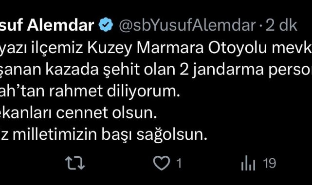 Sakarya Büyükşehir Belediye Başkanı Yusuf Alemdar, Akyazı ilçesinde meydana gelen trafik kazasında şehit olan 2 jandarma personeli için taziye mesajı yayımladı.