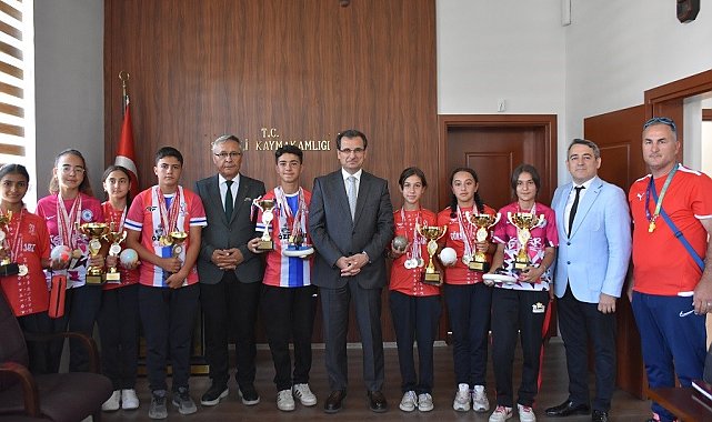 Manisa'nın Salihli ilçesi Durasıllı Mimar Sinan Ortaokulu öğrencileri, Muğla Akyaka'da yapılan Okul Sporları Bocce Petank ve Volo Türkiye Şampiyonasında kazandıkları kupa ve madalyaları Kaymakam Ali Güldoğan'a götürdü.