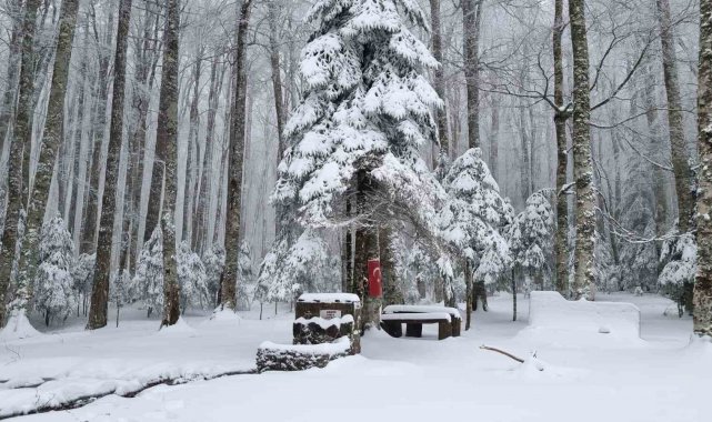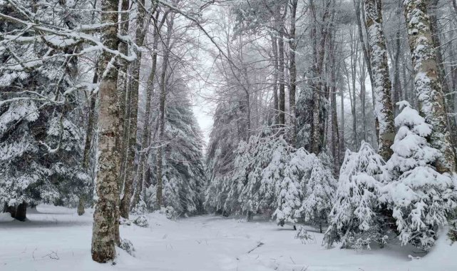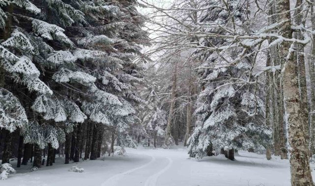 Karla kaplanan ormanlık alanlar, ağaçların üzerini saran beyaz örtü ve sisle birleşen manzaralar görsel şölen oluştururken, bölge hem fotoğraf tutkunları hem de doğaseverler için cazibe merkezi haline geldi.