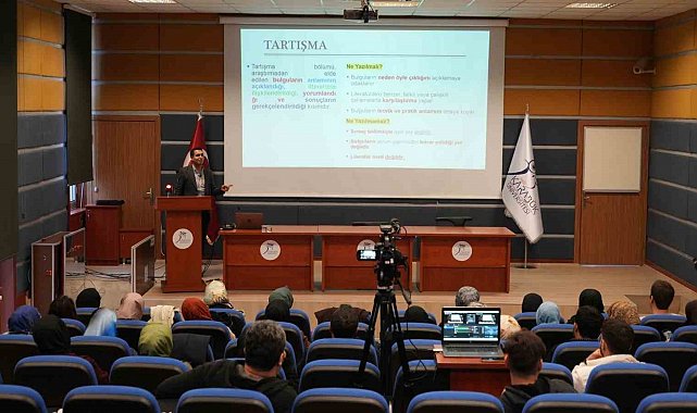 Seminerin konuşmacısı KBÜ İnsan ve Toplum Bilimleri Fakültesi öğretim üyesi Doç. Dr. Mahmut Polatcan, tez yazım sürecinin kritik aşamalarından olan tartışma, sonuç ve öneri bölümlerinin akademik standartlara uygun hazırlanmasının araştırmanın bütünlüğü açısından önem taşıdığını söyledi. Polatcan, tartışma bölümünün bilimsel araştırmanın kalbi niteliğinde olduğunu vurgulayarak, öğrencileri buldukları arasında anlamlı ilişki kurma, literatürle karşılaştırma yapma ve araştırma sorularını yanıtlamada dikkat edilmesi gereken noktalar hakkında bilgilendirdi.