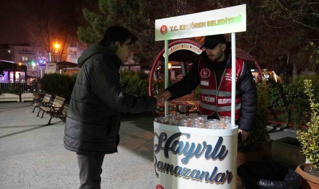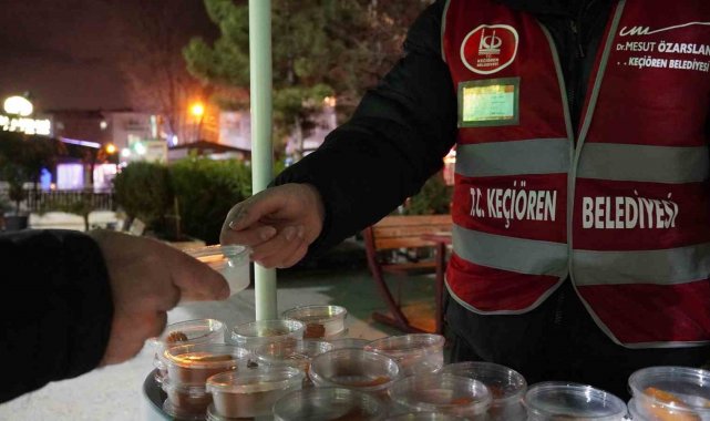 Keçiören Belediyesi, iftar saatinde trafikte ve yolda olan vatandaşlara içinde hurma, su ve sandviç yer alan kumanyalar dağıtırken, teravih namazından sonra da camilerde tatlı ikramı yapıyor.
