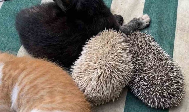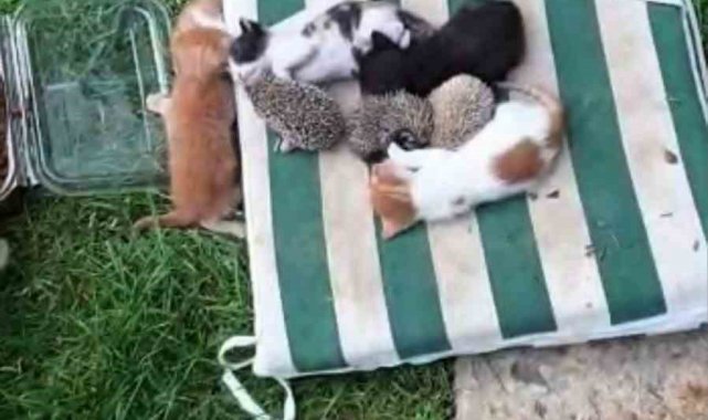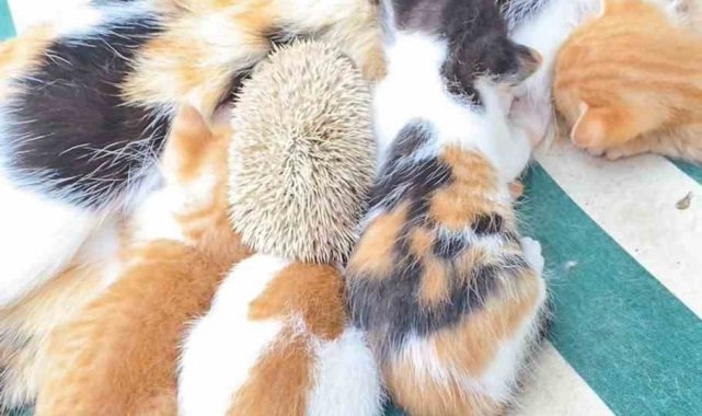 Yavru kedilerin, kirpilerin dikenlerine aldırış etmeden onlarla uyuması ve birlikte beslenmesi, görenleri gülümsetti.