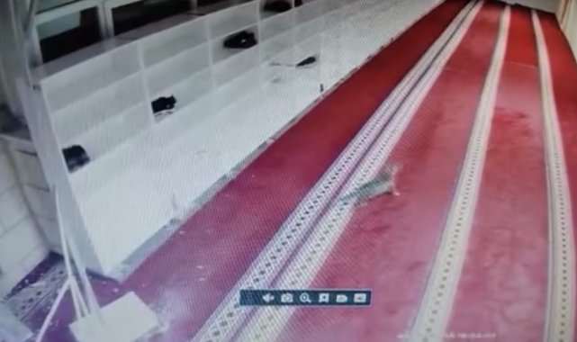 Elazığ'da camiye giren bir kedi, asma tavanı yıkarak aşağı düştü. O anlar kameralara yansıdı.
