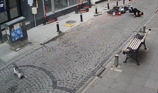 Eskişehir'de 19 yaşındaki kasksız sürücüsü, süratle girdiği ara sokakta aniden önüne fırlayan kediye çarpmamaya çalışırken kullandığı motosikleti devirerek yere düştü. Sürücünün hem kediye çarptığı hem de başını beton saksıya vurarak ağır yaralandığı kaza anı güvenlik kamerasına yansıdı.