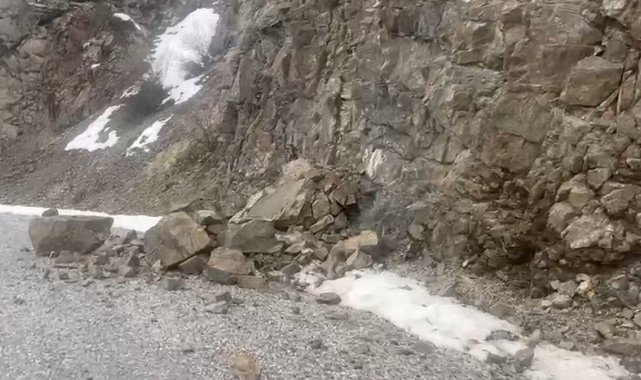 Erzincan'ın Kemah ilçesinde meydana gelen 4,9 büyüklüğündeki depremin ardından depremin merkez üssü olan Hakbilir köyü yoluna dağdan kopan kayalar düştü.