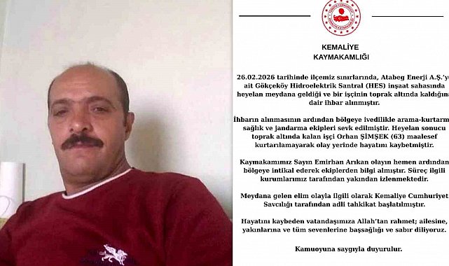 Açıklamada, Kemaliye ilçesinde, Atabeg Enerji A.Ş.'ye ait Gökçeköy Hidroelektrik Santral (HES) inşaat sahasında heyelan meydana geldiği ve bir işçinin toprak altında kaldığı yönünde ihbar alındığı belirtildi.