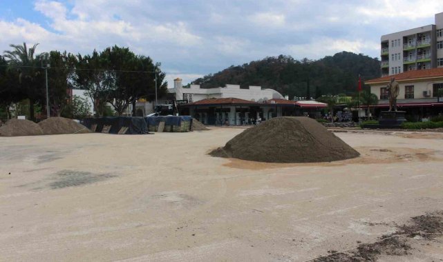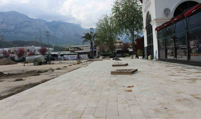 Antalya Büyükşehir Belediyesi ve Kemer Belediyesi işbirliği ile Kemer Cumhuriyet Meydanı turizm sezonuna hazırlanıyor. Meydanın araç giriş çıkışı nedeniyle yıpranan traverten taş kaplamaları değiştiriliyor.