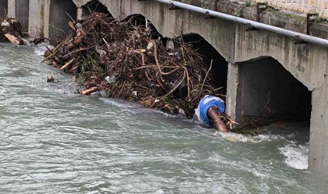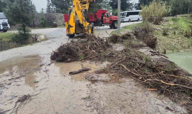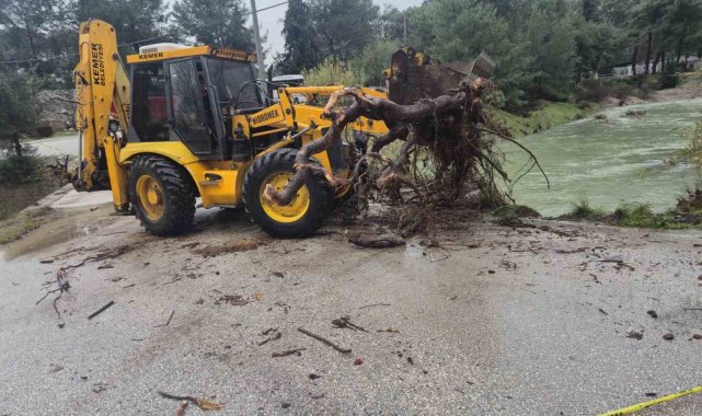 Dün akşam saatlerinden itibaren yaşanan şiddetli sağanak yağış Kemer'de hayatı olumsuz etkilerken bazı köprüler derelerden akan su ile gelen tomruklar nedeniyle tıkandı. Herhangi bir sel baskınının yaşanmaması için çalışmalarını sürdüren belediye ekipleri, tomrukları bulundukları yerden temizledi. Kemer genelinde tıkanan mazgalların da temizliğini yapmaya devam eden belediye ekipleri, Somak Seniri mevkisinde de yola düşen toprak yığınlarını temizledi.
