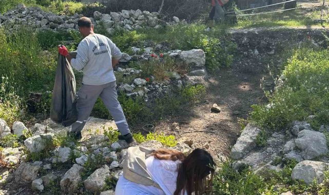 Kemer'de yaşayan yabancı uyruklu kadınlar, Kemer Belediyesi Temizlik İşleri Müdürlüğü ve İklim Değişikliği ve Sıfır Atık Müdürlüğü ekipleri ile Çalış Tepesi ile Ayışığı Parkı arasında bulunan koy ve ormanlık alanda temizlik yaptı.