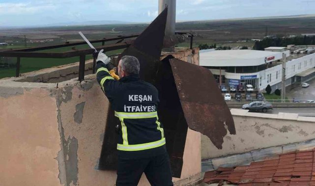 Meteoroloji'nin kuvvetli yağış ve rüzgar uyarısının ardından, Keşan ilçe genelinde de esen şiddetli rüzgar hayatı olumsuz etkiledi. İlçe merkezindeki bazı apartmanların çatıları uçtu. Keşan İtfaiye Müdürlüğü ekipleri, çatılarda kopmak üzere olan ve tehlikeye sebep olacak malzemeleri sökerek aşağı indirdi.