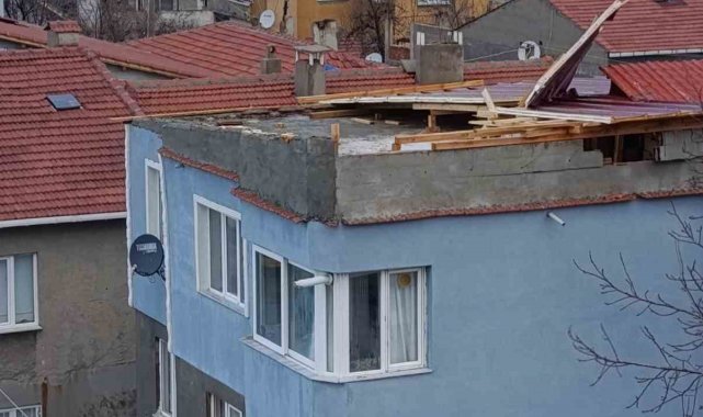 Edirne'nin Keşan ilçesinde şiddetli rüzgar sebebiyle bazı evlerin çatıları uçarken, Yayla köyü sahilindeki bir iş yerinin kaplamaları söküldü.