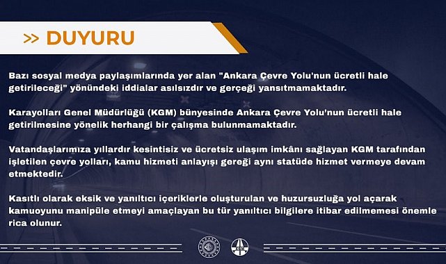 KGM tarafından yapılan açıklamada, "Bazı sosyal medya paylaşımlarında yer alan 'Ankara Çevre Yolu'nun ücretli hale getirileceği' yönündeki iddialar asılsızdır ve gerçeği yansıtmamaktadır. Karayolları Genel Müdürlüğü bünyesinde Ankara Çevre Yolu'nun ücretli hale getirilmesine yönelik herhangi bir çalışma bulunmamaktadır. Vatandaşlarımıza yıllardır kesintisiz ve ücretsiz ulaşım imkanı sağlayan KGM tarafından işletilen çevre yolları, kamu hizmeti anlayışı gereği aynı statüde hizmet vermeye devam etmektedir. Kasıtlı olarak eksik ve yanıltıcı içeriklerle oluşturulan ve huzursuzluğa yol açarak kamuoyunu manipüle etmeyi amaçlayan bu tür yanıltıcı bilgilere itibar edilmemesi önemle rica olunur" ifadelerine yer verildi.