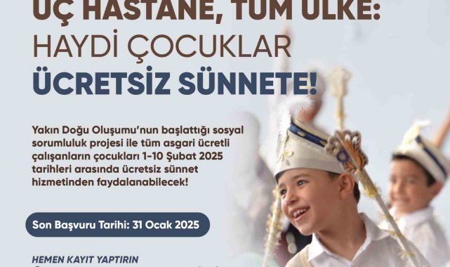 Yakın Doğu Oluşumu'nun başlattığı sosyal sorumluluk projesi ile asgari ücretli çalışanların çocukları ücretsiz olarak sünnet olacak. Yarıyıl tatilinde, 1-10 Şubat tarihlerinde geçerli olacak kampanyaya katılmak için son başvuru tarihi 31 Ocak olarak açıklandı.
