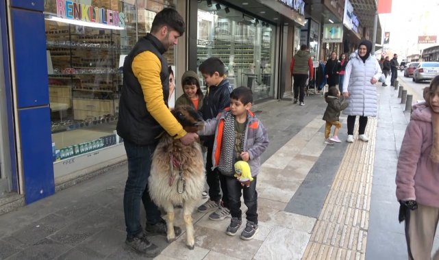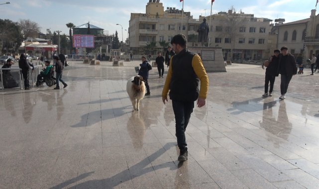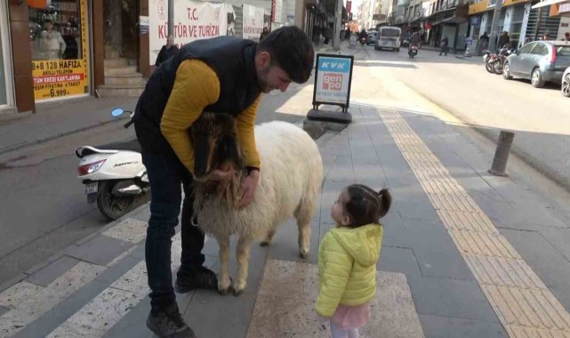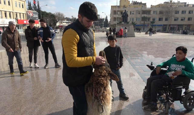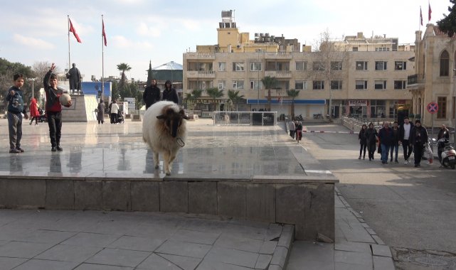 Kilis sokaklarında koyunu ile gezen genç ilgi odağı oldu