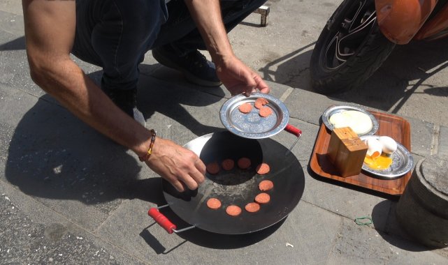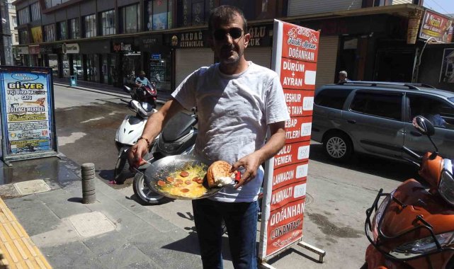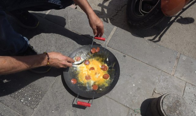 Kavurucu sıcakların etkisini sürdürdüğü Kilis'te hava sıcaklığı 42 dereceyi aştı. Sıcaklığın etkisini göstermek isteyen aşçı Erdoğan Aktaş, betonun üzerine tava koyarak yumurta pişirdi. Güneşin etkisiyle dakikalar içinde pişen sucuklu yumurta, servise hazır hale geldi.