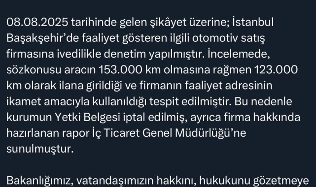 Konuya ilişkin açıklama yapan Ticaret Bakanlığı Basın Danışmanı Bekir Kaplan, şu ifadeleri kullandı: "08.08.2025 tarihinde gelen şikâyet üzerine; İstanbul Başakşehir'de faaliyet gösteren ilgili otomotiv satış firmasına ivedilikle denetim yapılmıştır. İncelemede, söz konusu aracın 153 bin km olmasına rağmen 123 bin km olarak ilana girildiği ve firmanın faaliyet adresinin ikamet amacıyla kullanıldığı tespit edilmiştir. Bu nedenle kurumun Yetki Belgesi iptal edilmiş, ayrıca firma hakkında hazırlanan rapor İç Ticaret Genel Müdürlüğü'ne sunulmuştur. Bakanlığımız, vatandaşımızın hakkını, hukukunu gözetmeye devam edecektir."