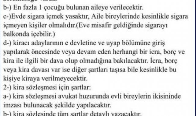 Denizli'de 3+1 dairesini 35 bin liraya kiraya vermek isteyen bir ev sahibinin ilan sitesinde paylaştığı 3 sayfalık kriter listesi, sosyal medyada ve kamuoyunda tartışma oluşturdu. İlanda yer alan şartlar arasında yalnızca resmi nikâhlı ailelere kiralama yapılacağı, en az bir aile bireyinin memur olması gerektiği, en fazla bir çocuklu ailelerin kabul edileceği belirtildi. Ev içinde sigara içilmesinin kesinlikle yasak olduğu, mutfak tezgâhında kirli bulaşık bırakılmaması ve tezgâhın ıslak tutulmaması gibi detaylar da dikkat çekti. Ayrıca evde kullanılacak tüm eşyaların ayaklarında zemini korumak için keçe bulunması, eşyalar ile duvar arasında boşluk bırakılması ve evin 50 günde bir kiracının uygunluğunda 15 dakika süreyle kontrol edileceği maddeleri yer aldı. Söz konusu ilan, kiracı adayları ve vatandaşlar tarafından "aşırı kuralcı" bulunarak eleştirildi.