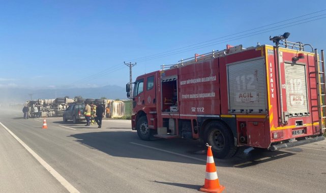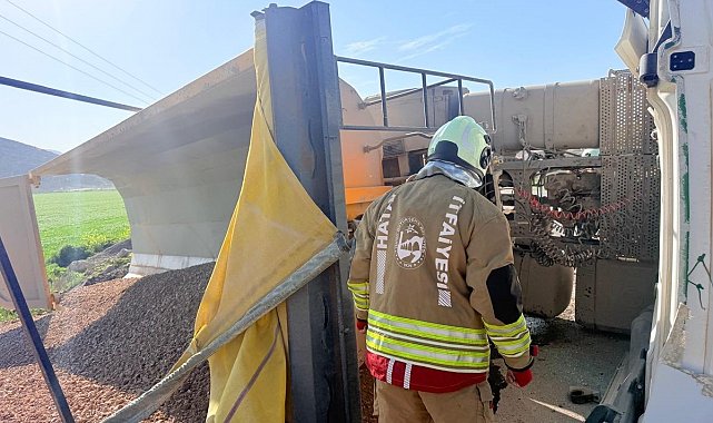 Hatay'da sürücünün kontrolünü kaybetmesiyle devrilen hafriyat kamyonunun sürücüsü yaralandı.