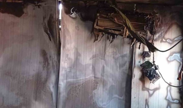 Hatay'da depremzede ailenin yaşadığı konteyner alev alev yanarak kullanılmaz hale geldi.