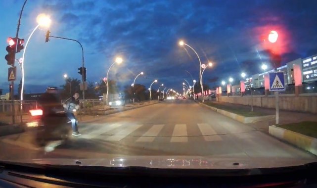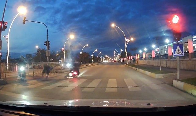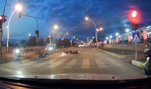 Kaza anı, kavşakta ışıkta bekleyen bir aracın kamerası tarafından kaydedildi. Görüntülerde çarpmanın ardından motosikletli ve yayanın yola savrularak sürüklendiği görüldü.
