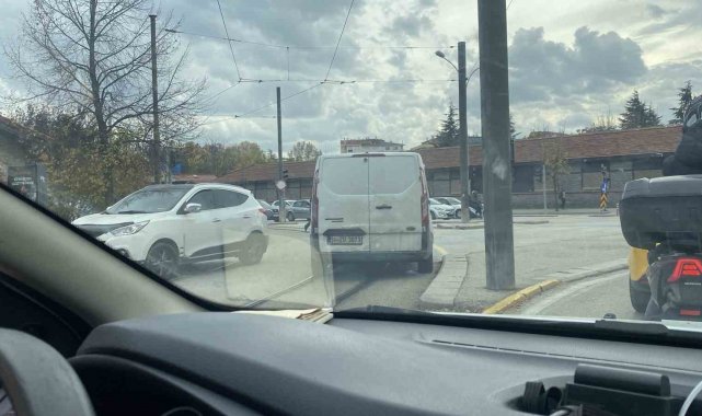 Eskişehir'de kırmızı ışıkta beklemek yerine tramvay yolunun kenarındaki banketin üstünden geçip dönüş yapan panelvan araç görenleri hayrete düşürdü.