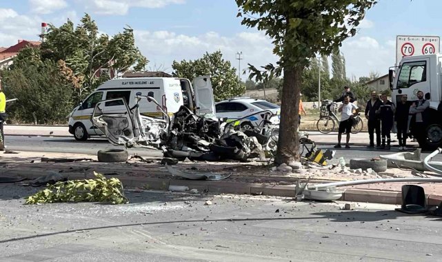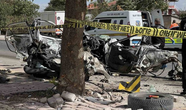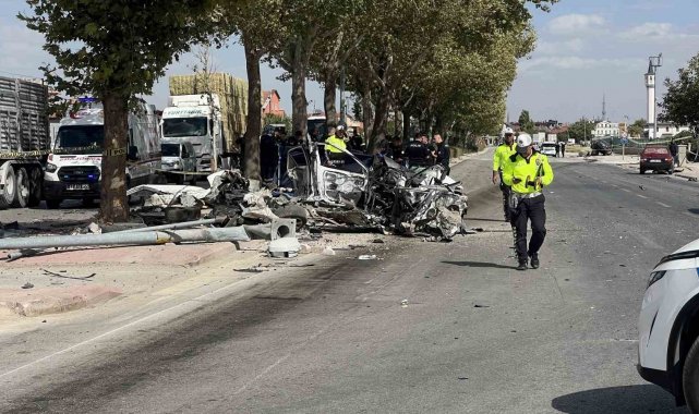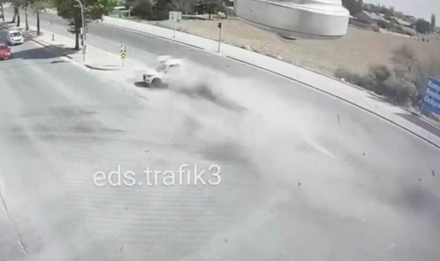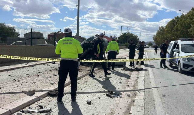 Konya'da kırmızı ışıkta bekleyen otomobilin, son sürat gelen başka bir otomobilin çarpması sonucu direğe ve ağaca çarpıp ikiye bölündüğü ve sürücüsünün hayatını kaybettiği kaza güvenlik kamerasına saniye saniye yansıdı.