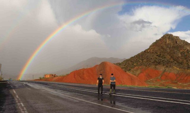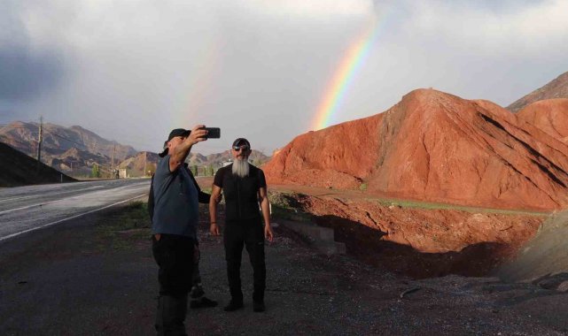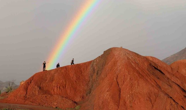 Erzurum'un Oltu ilçesinde etkili olan yağmurun ardından Yolboyu Mahallesi'nde bulunan Kırmızı Tepeler, gökkuşağı ile birlikte adeta görsel bir şölen sundu.