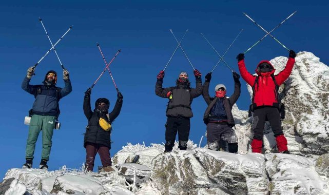 Dağcı Tayfun Doğan, kış tırmanışı yaptıklarını belirterek, "Zorlu hava şartlarına rağmen Gönül Dağı'nın Kale Tepe Zirvesi'ne tırmanışımızı gerçekleştirdik" dedi.