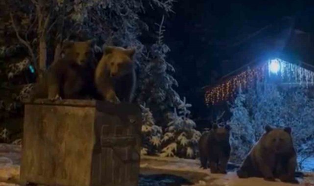 Bursa Uludağ'da yerleşim alanlarına inen ayılar, çöp konteynerlerinin üzerinde dolaştı. Çöp konteynerini karıştıran 1 anne ve 3 yavru ayının, bölgede kar yağmasına rağmen hala kış uykusuna yatmamaları dikkat çekti.