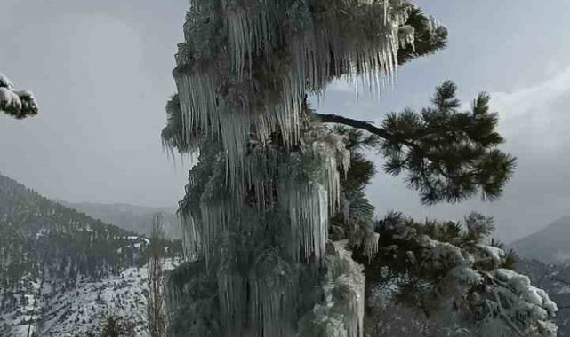 Saimbeyli ilçesine bağlı Gökmenler Mahallesi'nde kar yağışı etkili oldu. Yağan karla birlikte çam ağaçları buz tuttu, oluşan uzun buz sarkıtları doğada görsel şölen sundu. Beyaz örtüyle kaplanan bölgede, çam ağaçlarının dallarından aşağı doğru uzayan metrelerce buz sarkıtları ile kar manzarası aynı karede buluştu.