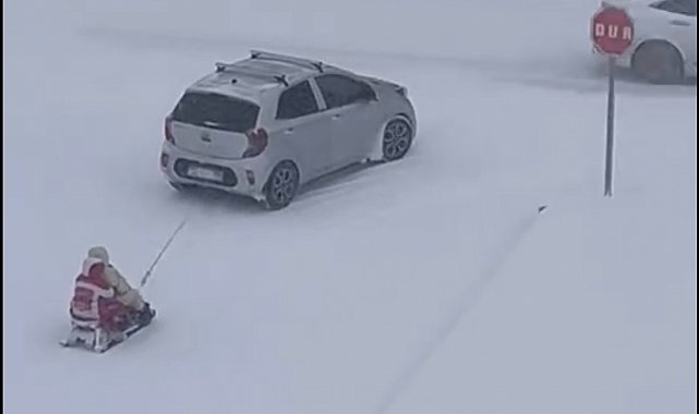 Kızağı araca bağlayıp çektiler, tehlikeli eğlence kameraya yansıdı