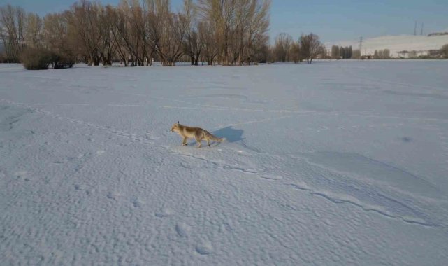 Erzurum'da karlı ovada avlanan Tilki dron ile görüntülendi.