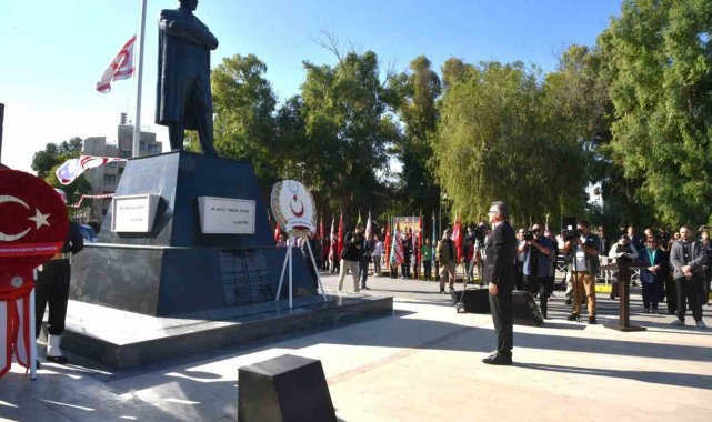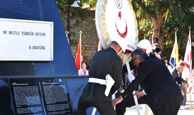 Kuzey Kıbrıs Türk Cumhuriyeti'nin kuruluşunun 42'nci yıl dönümü, ülke genelinde düzenlenen tören ve etkinliklerle kutlanıyor. Törenler KKTC Cumhurbaşkanı Tufan Erhürman'ın Cumhurbaşkanlığı'nda saat yerel saatle 08.45'teki tebrik kabulüyle başladı. Tebrik kabulünün ardından Girne Kapısı'ndaki Atatürk Anıtı önünde tören düzenlendi. Törene Cumhurbaşkanı Yardımcısı Cevdet Yılmaz, Cumhuriyet Halk Partisi (CHP) Genel Başkanı Özgür Özel, KKTC Cumhurbaşkanı Tufan Erhürman, Cumhuriyet Meclis Başkanı Ziya Öztürkler, KKTC Başbakanı Ünal Üstel, Yüksek Mahkeme Yargıcı Gülden Çiftçioğlu, 2. Cumhurbaşkanı Mehmet Ali Talat, 5. Cumhurbaşkanı Ersin Tatar, Türkiye'nin Lefkoşa Büyükelçisi Ali Murat Başçeri, TBMM Başkanvekili Celal Adan, Türkiye Milli Savunma Bakanlığı temsilcisi Muharip Hava Kuvveti Komutanı Hava Orgeneral Rafet Dalkıran, Kıbrıs Türk Barış Kuvvetleri (KTBK) Komutanı Korgeneral Sebahattin Kılınç, KKTC Güvenlik Kuvvetleri (GKK) Komutanı Tümgeneral İlker Görgülü ile parti ve kuruluşların temsilcileri katıldı. Anıta çelenk bırakılmasıyla başlayan tören, saygı duruşu ve İstiklal Marşı eşliğinde bayrakların göndere çekilmesiyle devam etti.