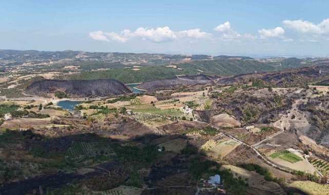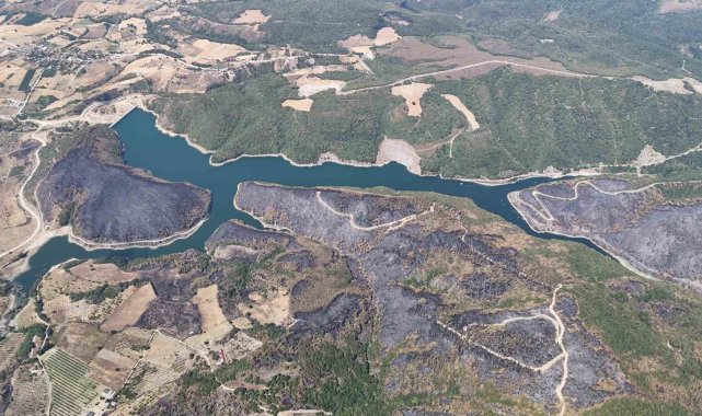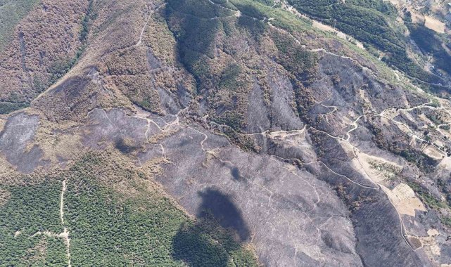 Yangın sonrası bölgede dron ile çekilen görüntüler, felaketin boyutunu gözler önüne serdi. Havadan kayda alınan görüntülerde, bir tarafta yeşilin, diğer tarafta siyahın tonlarının olduğu görüldü.