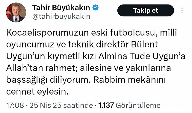 A Milli Takım'ın ve Kocaelispor'un eski futbolcusu, teknik direktör Bülent Uygun'un kızı Almina Tude'nin vefatı nedeniyle Kocaelispor Kulübü ve Kocaeli Büyükşehir Belediye Başkanı Tahir Büyükakın başsağlığı mesajı paylaştı