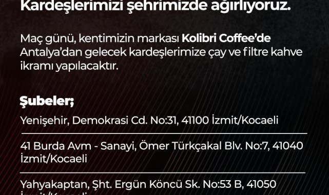 Trendyol Süper Lig'in 17. haftasında Kocaelispor, yarın akşam Antalyaspor'u konuk edecek. 1999 Gölcük Depremi'nin ardından temeli atılan ve her maçta kendini gösteren iki camianın dostluğu karşılaşma öncesinde hazırlıklara da yansıdı. Şehrin birçok yerinde "Kalbim iki parça; bir taraf Kocaeli, bir taraf Antalya" yazılı billboardlar asılırken, maça özel formalar hazırlandı
