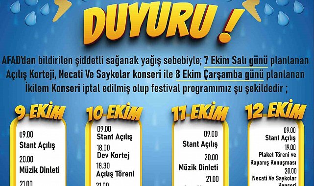 Meteoroloji tarafından 7 ve 8 Ekim tarihlerinde beklenen şiddetli sağanak yağış uyarısı üzerine festivalin açılış programı ileri bir tarihe ertelendi. Belediye tarafından yapılan açıklamada, 7 Ekim Salı ve 8 Ekim Çarşamba günleri yapılması planlanan etkinliklerin iptal edildiği, festivalin 9 Ekim Perşembe günü itibariyle yeni programla devam edeceği duyuruldu. Yenilenen festival takvimi ise 9 Ekim Perşembe saat 21.00 Suavi konseri, 10 Ekim Cuma saat 18.30 Dev Kortej, saat 19.00 Festival Açılışı, saat 21.00 Ayşe Dinçer konseri, 11 Ekim Cumartesi saat 21.00 Işın Karaca konseri, 12 Ekim Pazar saat 20.00 Necati ve Saykolar konseri saat 21.00 Zakkum konseri olarak açıklandı.