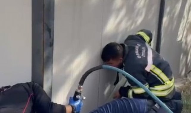 Osmaniye'de konteyner ile duvar arasına sıkışan yavru kedi, itfaiye ekiplerince kurtarıldı.