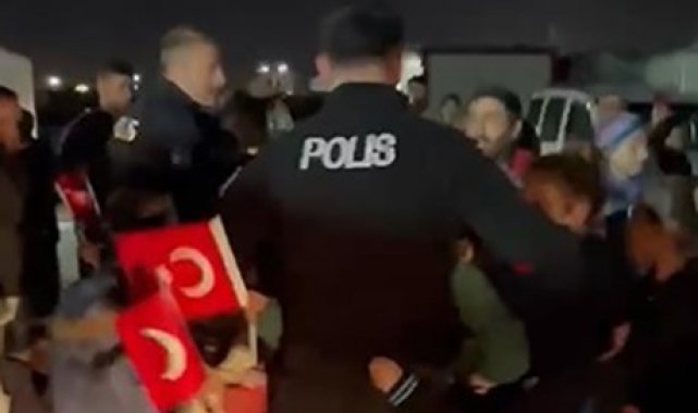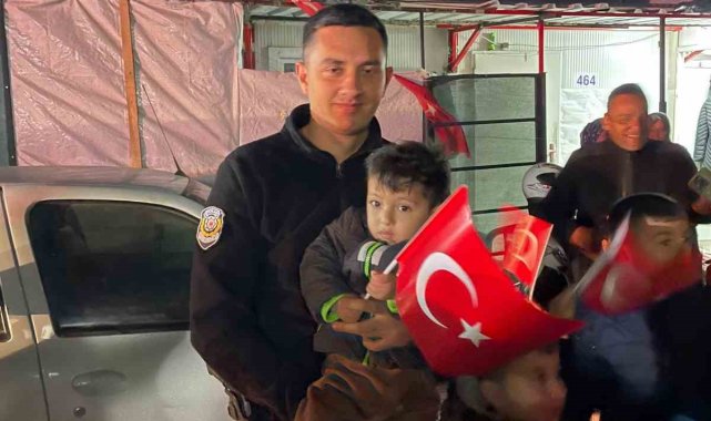 Hatay'da kavga ihbarında bulunarak polis ekiplerine sürpriz yapan konteyner kent sakinleri, pasta keserek bayraklı karşılama yaptı.