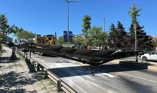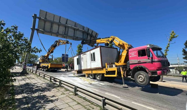 Konteyner yüklü vinç yönlendirme levhasına takıldı, kamyon adeta şaha kalktı